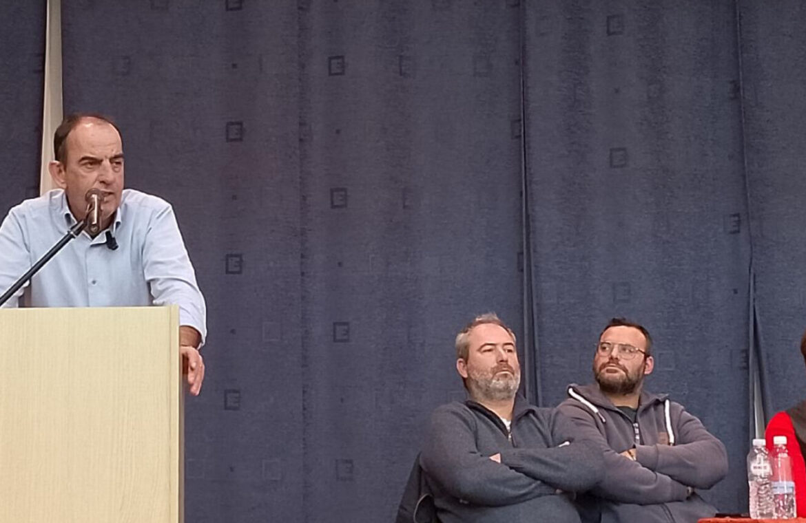 Στο βήμα για την εισήγηση είναι ο Ρίζος Μαρούδας, πρόεδρος της Ενωτικής Ομοσπονδίας Αγροτικών Συλλόγων Ν. Λάρισας,  ο οποίος ανέδειξε την ανάγκη  οργάνωσης πολύμορφων και πανελλαδικά συντονισμένων κινητοποιήσεων.