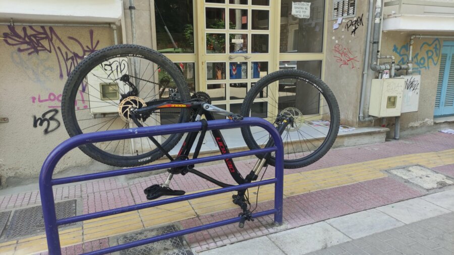 Άποψη; Επιλογή; Κανείς δεν ξέρει τι είχε στο μυαλό του ο Λαρισαίος που επέλεξε να «κλειδώσει» το ποδήλατό του έτσι στην οδό Ασκληπιού.