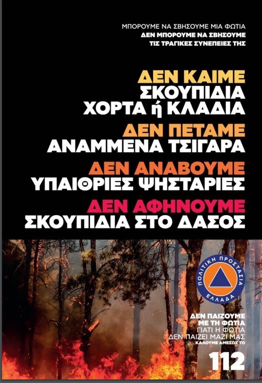 Σε περίπτωση που αντιληφθούν καπνό η φωτιά οι πολίτες καλούνται να ειδοποιούν αμέσως την Πυροσβεστική Υπηρεσία στον αριθμό κλήσης 199 και τον Ευρωπαϊκό Αριθμό Έκτακτης Ανάγκης 112 και να ακολουθούν τις υποδείξεις των αρμόδιων Αρχών.