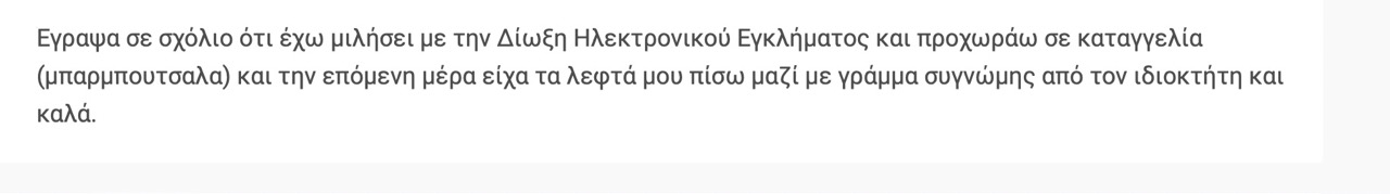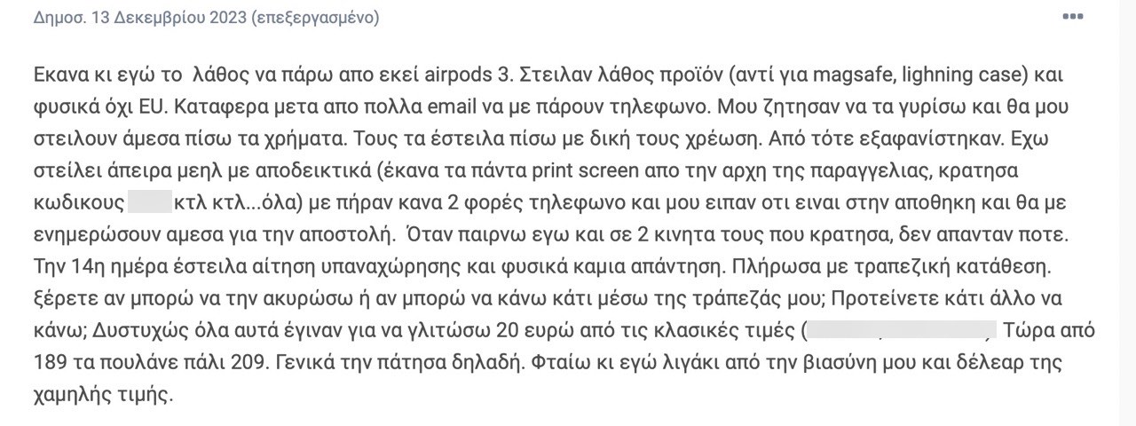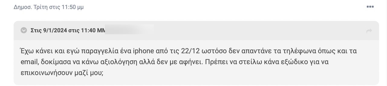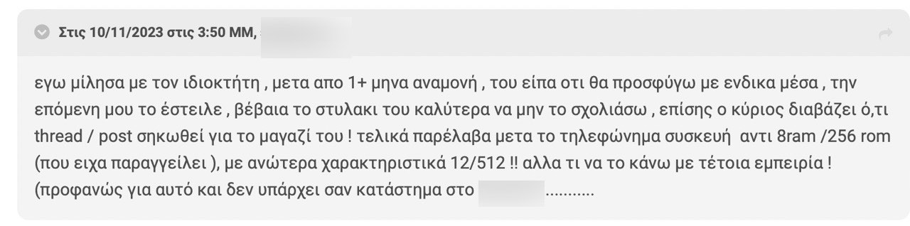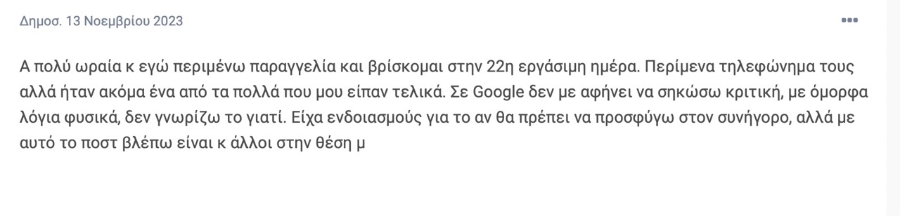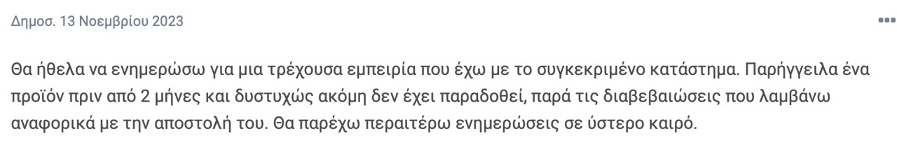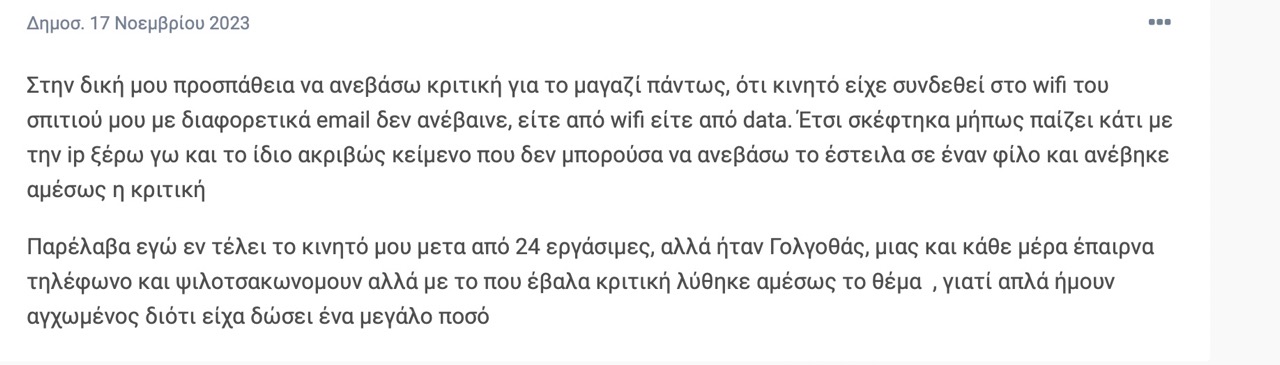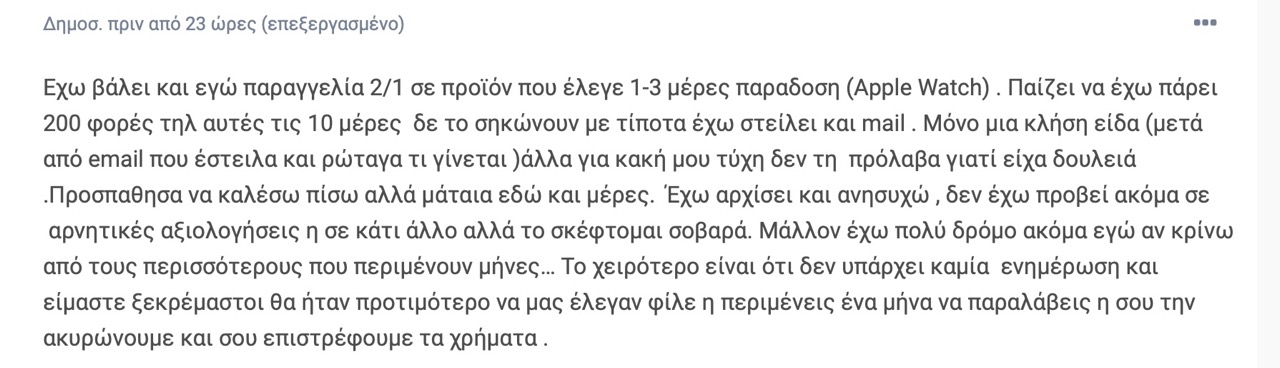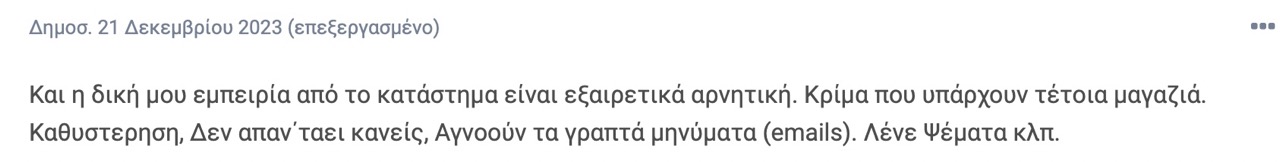 Το περίεργο της υπόθεσης είναι ότι, όπως αναφέρουν οι καταγγέλλοντες, απαυδισμένοι πια από την αδιαφορία των ιθυνόντων του καταστήματος, στρέφονται στη λύση των αξιολογήσεων στο google ή στα σχόλια στο διαδίκτυο, και μόλις γράψουν μια κακή κριτική για ότι τους έχει συμβεί, τότε και μόνο το κατάστημα επικοινωνεί μαζί τους και τελικά ή τους στέλνει άμεσα το προϊόν που παρήγγειλαν και προπλήρωσαν, ή αν είναι αυτή η επιθυμία του πελάτη, τους επιστρέφει τα χρήματα.