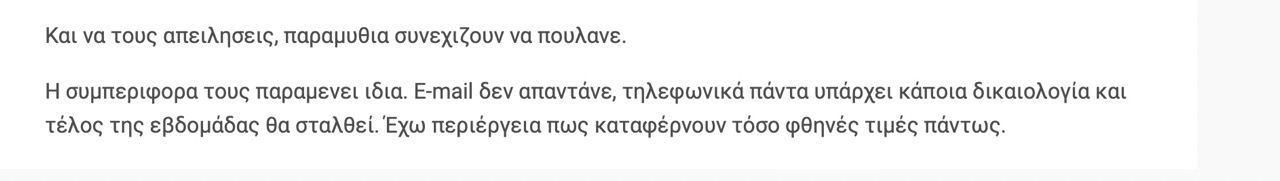 Μάλιστα το κατάστημα δεν απαντάει σχεδόν ποτέ στα  e mail τους, ενώ αν σταθούν τυχεροί και τους απαντήσουν στο τηλέφωνο, η αντιμετώπιση είναι πάντα η ίδια: «Συγνώμη για την καθυστέρηση, την επόμενη εβδομάδα θα έχετε το προϊόν στα χέρια σας», όμως οι εβδομάδες περνούν και τα προϊόντα παραμένουν… άφαντα».