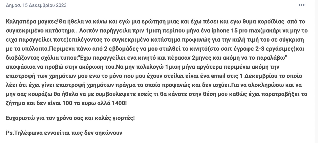 Το εν λόγω κατάστημα πουλάει ακριβά κινητά τηλέφωνα σε πολύ ελκυστικές τιμές με αποτέλεσμα οι πελάτες να πολλαπλασιάζονται, ωστόσο πολλαπλασιάζονται και τα παράπονα, καθώς παρότι έχουν καταθέσει τα χρήματα στον τραπεζικό λογαριασμό του καταστήματος, έχουν περάσει πολλές μέρες και σε αρκετές περιπτώσεις και μήνες, χωρίς το προϊόν να έχει σταλεί ποτέ στους ίδιους.