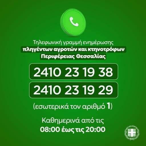Για την εξυπηρέτηση των πληγέντων αγροτών και κτηνοτρόφων λειτουργούν δυο τηλεφωνικές γραμμές από 08:00 π.μ. έως 20:00 μ.μ. στο υποκατάστημα του ΕΛ.Γ.Α. Λάρισας.