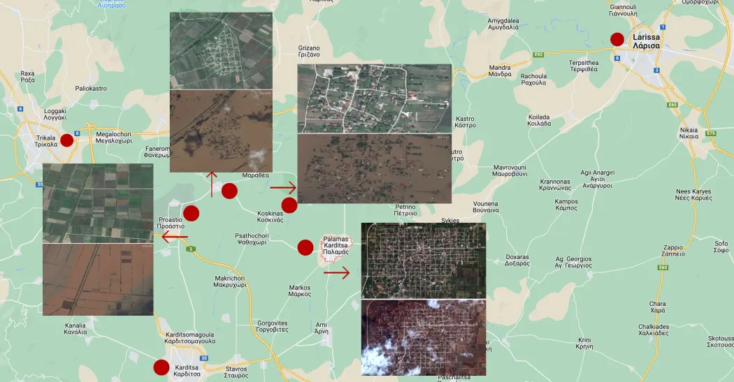 Σε αυτές αποτυπώνεται το πριν και το μετά τις πλημμύρες, ειδικά στις περιοχές της Καρδίτσας που βρέθηκαν κάτω απ’ τα λασπόνερα.