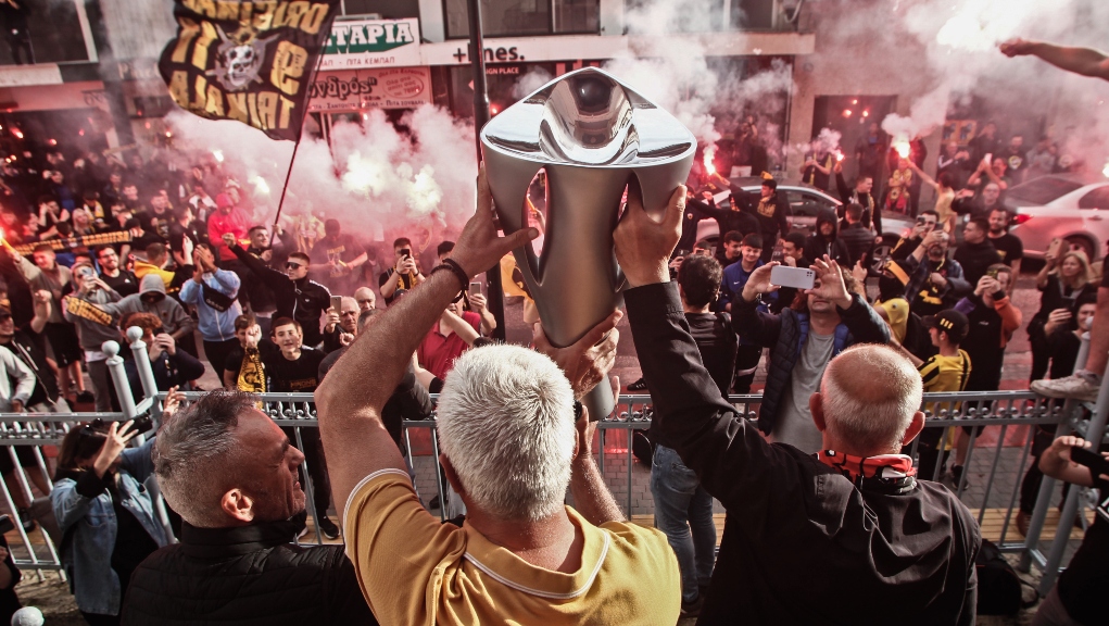 Με θερμή υποδοχή, συνθήματα και καπνογόνα, δεκάδες φίλοι και φίλες της ΑΕΚ υποδέχθηκαν το απόγευμα της Τρίτης (30/5) το κύπελλο του πρωταθλήματος που κατέκτησε η “Ένωση”.