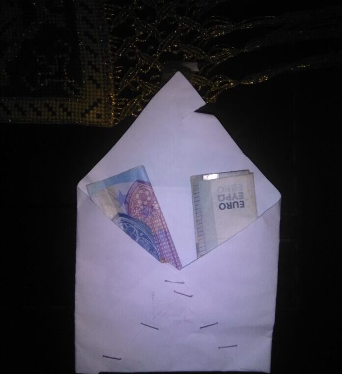 Δύο χαρτονομίσματα που ήταν το χαρτζιλίκι τους, και όλη τους η αγάπη ήταν τοποθετημένη σ’ ένα αυτοσχέδιο φακελάκι. ΥΠΈΡΟΧΗ ΕΙΚΌΝΑ! Αυτή την κίνηση επαναλαμβάνουν κάθε φορά που έρχονται από το χωριό τους για να εξομολογηθούν.
