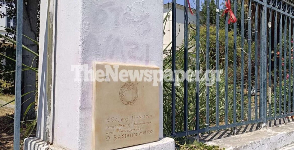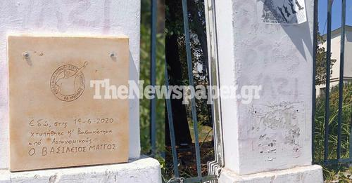 Στο μνημείο υπήρχε σκαλισμένη η φωτογραφία του Βασίλη Μάγγου, ενώ αναγράφονταν και τα εξής: «Εδώ, στις 14-6-2020, χτυπήθηκε και βασανίστηκε από αστυνομικούς, ο Βασίλης Μάγγος». Τώρα δεν υπάρχει.
