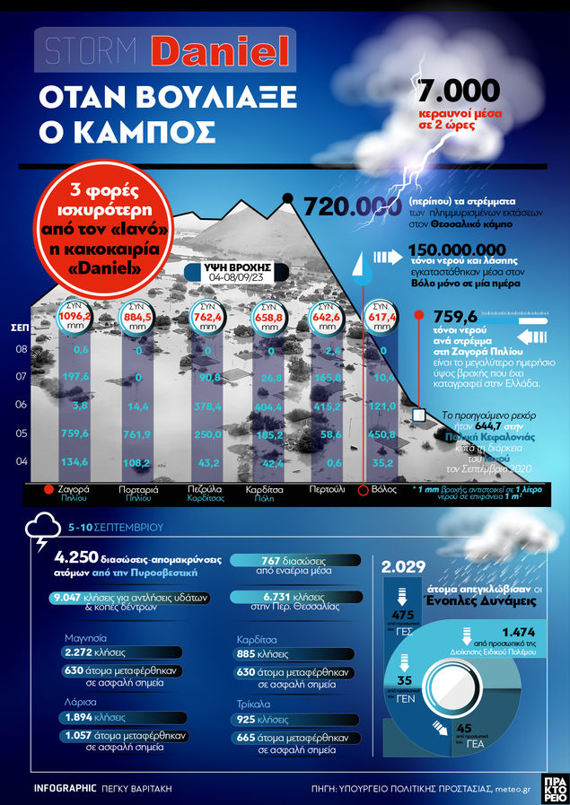 Το προηγούμενο ρεκόρ, σύμφωνα με το meteo, καταγράφηκε την περίοδο του Ιανού, τον Σεπτέμβριο του 2020, όπου 759,6 τόνοι νερού ανά στρέμμα είχαν προκαλέσει μεγάλα προβλήματα στην Κεφαλονιά.