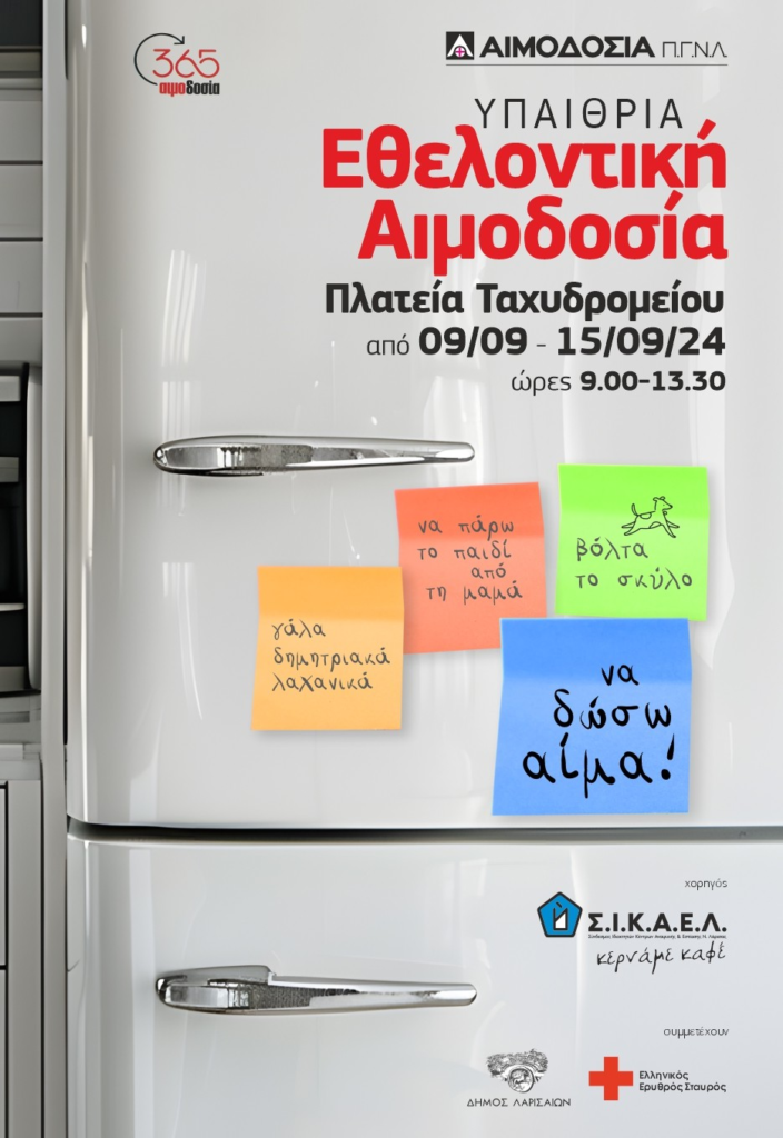 Το τμήμα Αιμοδοσίας του Πανεπιστημιακού Νοσοκομείου διοργανώνει Εβδομαδιαία Υπαίθρια Αιμοδοσία 9 Σεπτεμβρίου-15 Σεπτεμβρίου 9:30-1:30 το πρωί στην Πλατεία Ταχυδρομείου προκειμένου να διευκολυνθούν οι Εθελοντές Αιμοδότες και να ενισχυθούν τα αποθέματα αίματος