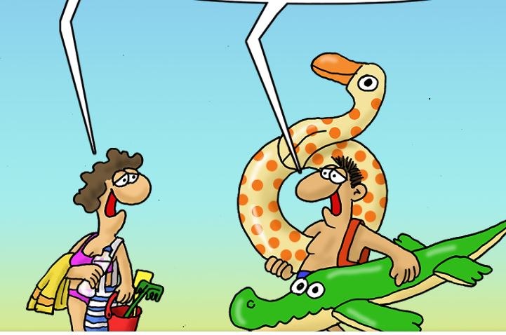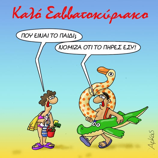 Ο Αρκάς στο σημερινό σκίτσο του μας δείχνει ένα ζευγάρι που πάει παραλία και είναι φορτωμένο με καλοκαιρινό εξοπλισμό.