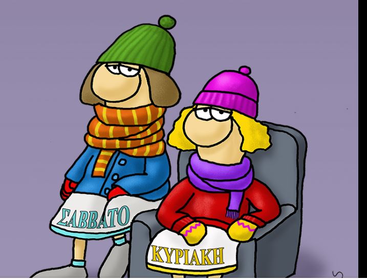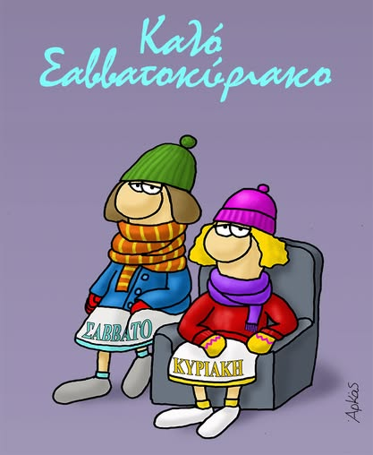Στο σημερινό σκίτσο του ο Αρκάς μας λέει «Καλό Σαββατοκύριακο», παρουσιάζοντας το Σάββατο και Κυριακή ντυμένες με σκουφιά και κασκόλ, περιμένοντας το χιόνι που προέβλεψαν οι μετεωρόγοι.