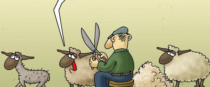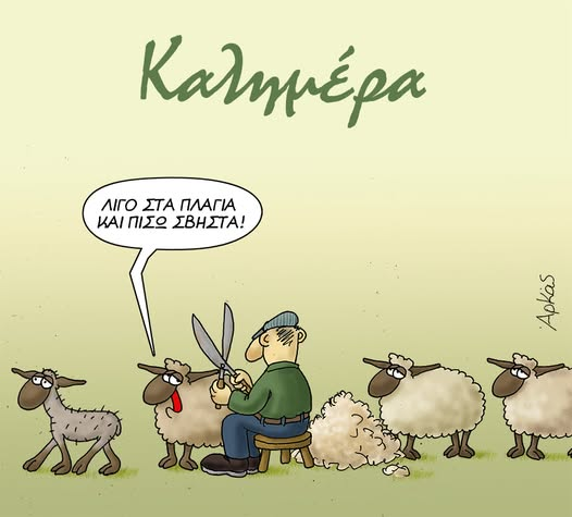 Ο Αρκάς στο σημερινό σκίτσο μας παρουσιάζει έναν βοσκό να κουρεύει τα πρόβατα και έναν από αυτό να λέει «Λίγο στα πλάγια και πίσω σβηστά».