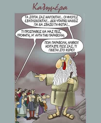 Την καλημέρα του μας λέει και σήμερα, Πέμπτη, ο γνωστός σκιτσογράφος Αρκάς, παρουσιάζοντας ένα νέο σκίτσο με πρωταγωνιστή τον «Προφήτη». Η σκηνή εκτυλίσσεται σε ένα χωριό που βρίσκεται στο χείλος της καταστροφής: σπίτια τυλίγονται στις φλόγες, ο καπνός πυκνώνει και κανείς δεν φαίνεται να έχει αντιληφθεί το μέγεθος της απειλής.