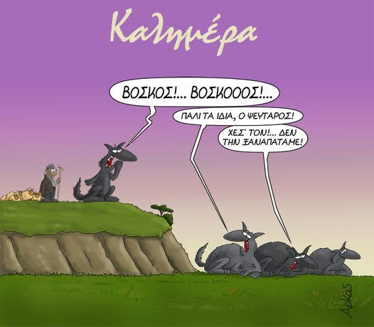 Ο Αρκάς στο σημερινό σκίτσο του μας δείχνει τους λύκους να λένε μεταξύ τους την ιστορία με τον βοσκό και το λύκο: