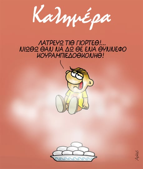 Lifestyle Αρκάς Δεκ 27, 2025 to kentri Twitter Facebook LinkedIn Pinterest Email Ο Αρκάς σε χριστουγεννιάτικο σκηνικό. Ο Αρκάς στο σημερινό σκίτσο του μας δείχνει τον Θανασάκη ανάμεσα σε κουραμπιέδες και να λέει: «Λατρεύω τιθ γιορτθέθ! Νιώθω θαν να δω δε ένα θύννεφο κουραμπιεδοθκόνηθ». Το σημερινό σκηνικό ❝ ετικέτες ❞ #ΑΡΚΑΣ