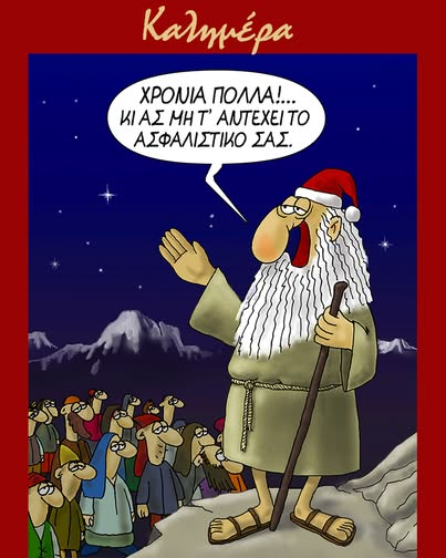 Ο γνωστός σκιτσογράφος σχεδίασε τον προφήτη πάνω στον βράχο, να μιλάει στους πιστούς του και να τους εύχεται χρόνια πολλά για τη νέα χρονιά, όμως με ένα… αλλά.