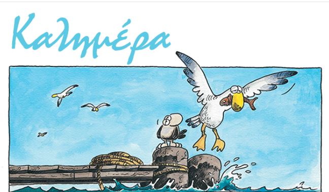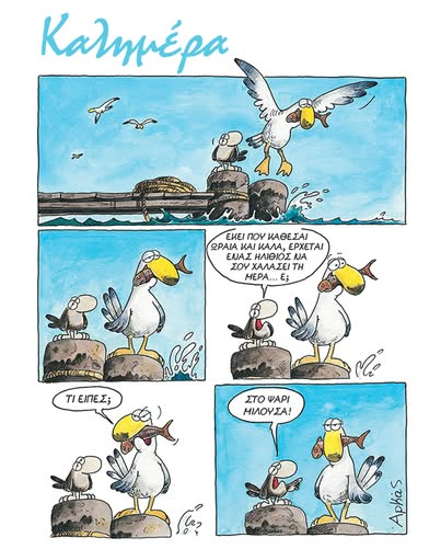 Ο Αρκάς στο σημερινό σκίτσο μας παρουσιάζει τα πουλιά, τα οποία κάθονται στην προκυμαία και λέει το μικρότερο στο μεγαλύτερο: «Εκεί που κάθεσαι ωραία και καλά, έρχεται ένας ηλίθιος να σου χαλάσει τη μέρα, ε;»