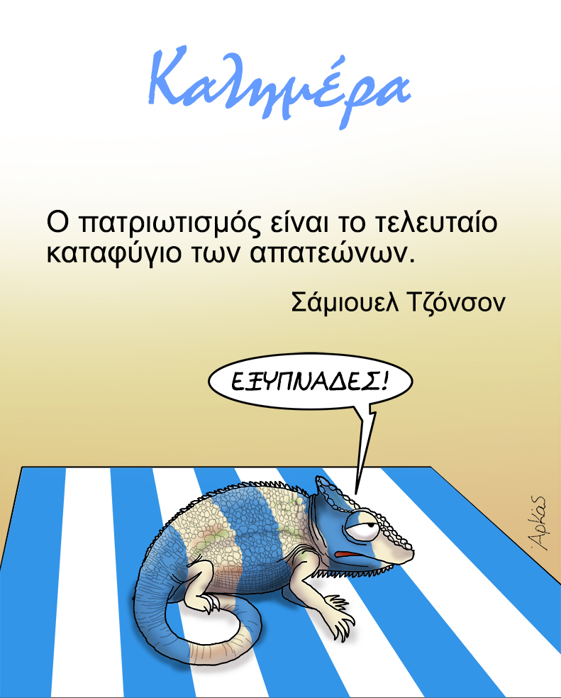 Ο σκιτσογράφος σήμερα μπαίνει στην ημέρα μας με ένα καυστικό σχόλιο. Συγκεκριμένα, στο εν λόγω σκίτσο βλέπουμε γραμμένη μια διάσημη φράση του Σάμιουελ Τζόνσον στην οποία αναφέρεται πως «Ο πατριωτισμός είναι το τελευταίο καταφύγιο των απατεώνων».