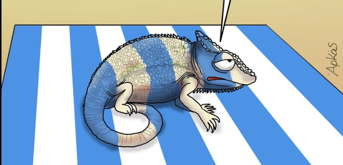 Στη φράση αυτή αντιδρά ένας χαμαιλέοντας τοποθετημένος πάνω σε ένα γαλανόλευκο πανί λέγοντας ειρωνικά: «Εξυπνάδες!».