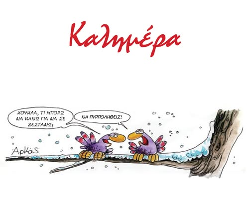 Lifestyle Αρκάς: Η καλημέρα της χειμωνιάτικης Κυριακής Δεκ 28, 2025 to kentri Twitter Facebook LinkedIn Pinterest Email Ο Αρκάς στέλνει τη σημερινή του καλημέρα. Ο Αρκάς στο σημερινό σκίτσο μας δείχνει τα πουλιά πάνω σε ένα κλαδί να λένε: «Κούκλα, τι μπορώ να κάνω για να σε ζεστάνω;» «Να πυρποληθείς» Το σημερινό σκίτσο ❝ ετικέτες ❞ #ΑΡΚΑΣ