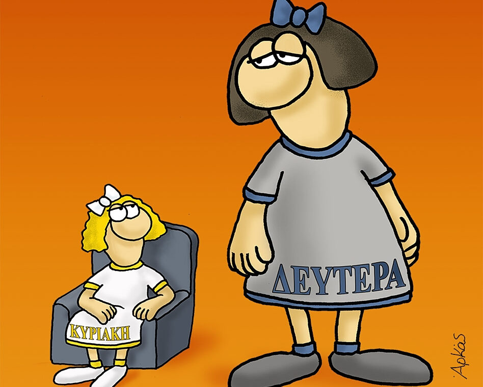 Στη σημερινή εικόνα βλέπουμε ένα έξυπνο παιχνίδι λέξεων: η «Μεγάλη» Δευτέρα παρουσιάζεται κυριολεκτικά μεγαλύτερη σε μέγεθος από την Κυριακή, που κάθεται μικρή και χαλαρή στην πολυθρόνα της.
