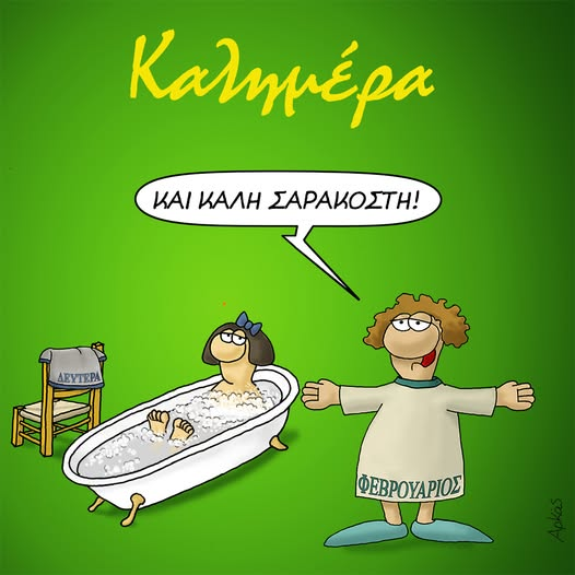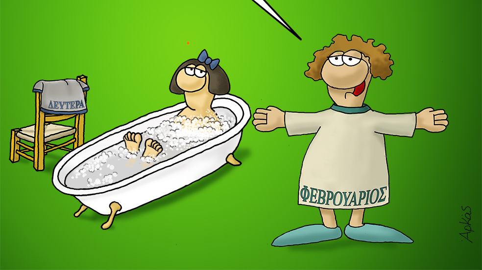 Ο γνωστός σκιτσογράφος μας βάζει στο κλίμα της ημέρας και μας καλωσορίζει με τον Φεβρουάριο να μας λέει «Καλή Σαρακοστή», ενώ η Δευτέρα κάνει… μπάνιο.