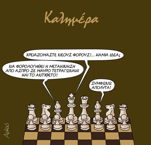 «Χρειαζόμαστε νέους φόρους!… Καμία ιδέα;». Η σημερινή καλημέρα του γνωστού σκιτσογράφου Αρκά προς τους διαδικτυακούς του φίλους αφορά μια φορολογική συζήτηση πάνω σε μια παρτίδα σκάκι.