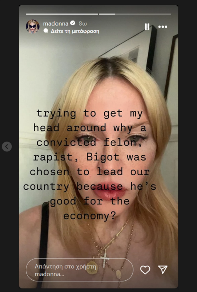 Στη συνέχεια η Μαντόνα δημοσίευσε και δεύτερη φωτογραφία, όπου έγραφε: «Προσπαθώ να αντιληφθώ πώς ένας καταδικασμένος, βιαστής, φανατικός επελέγη ως ο επόμενος ηγέτης της χώρας μας γιατί είναι καλό για την οικονομία;» έγραψε η Μαντόνα.