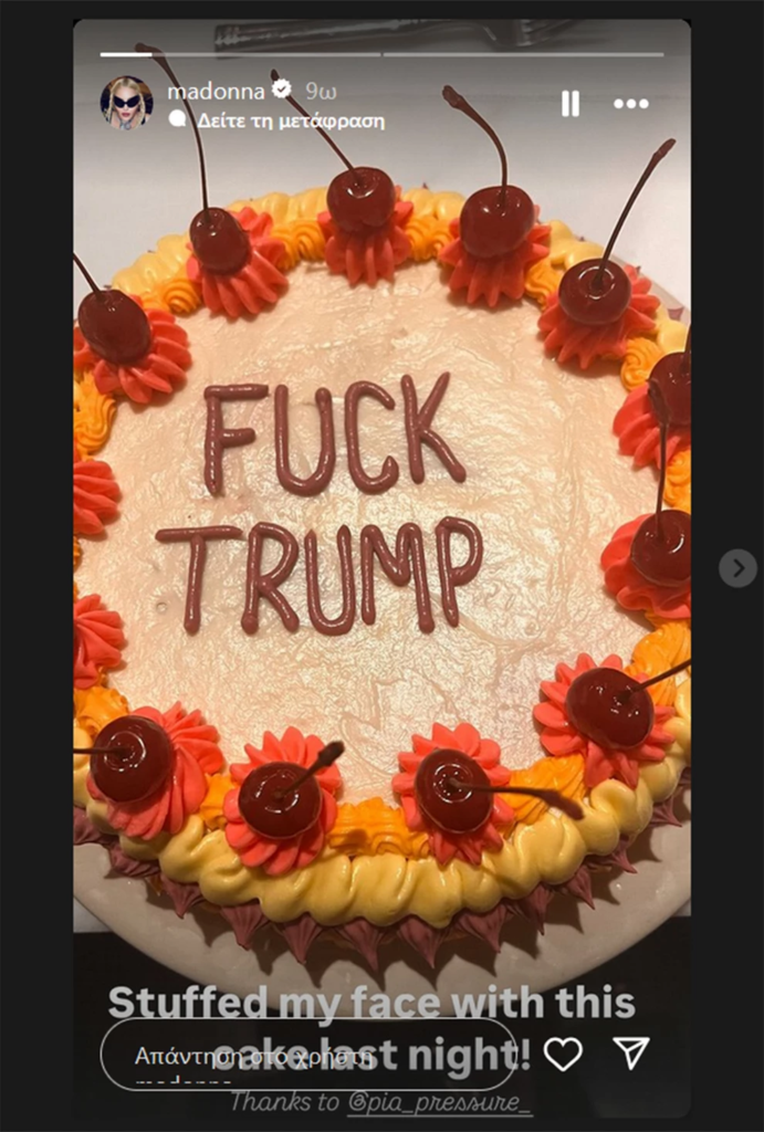 Η βασίλισσα της ποπ μουσικής δημοσίευσε στα Instagram Stories μια φωτογραφία με μια τούρτα που είχε ένα μήνυμα «γ…ω τον Τραμπ». «Γέμισα το πρόσωπό μου με αυτή την τούρτα χθες το βράδυ» πρόσθεσε η διάσημη τραγουδίστρια.