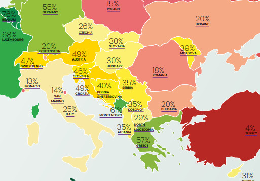 Όπως και το 2022, η Μάλτα βρίσκεται στην κορυφή της λίστας με 89%, ακολουθούμενη από το Βέλγιο και τη Δανία, που ισοβαθμούν με 76% – όλες πολύ πάνω από την Πολωνία (15%), τη Ρουμανία (18%) και τη Βουλγαρία (20%).