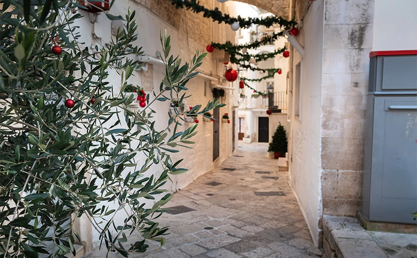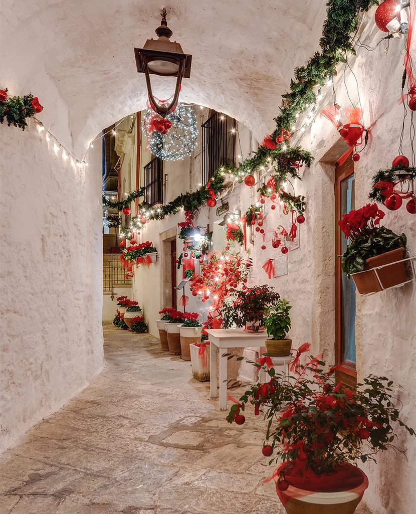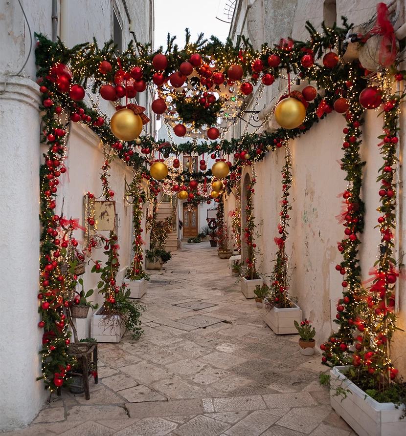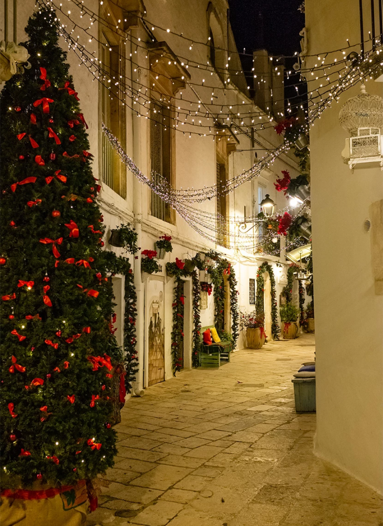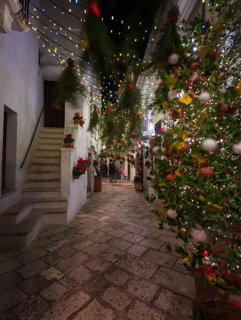 Περπατώντας στα σοκάκια του Locorotondo τα Χριστούγεννα είναι σαν να μπαίνεις σε ένα φωτεινό παραμυθένιο δάσος, με εκατοντάδες κλαδιά ελάτου να κρέμονται από ψηλά, κάνοντας την ατμόσφαιρα μαγική και απόλυτα ονειρική.