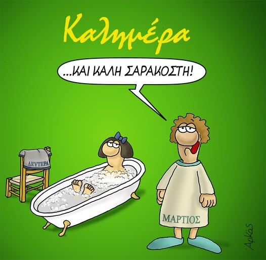 Ειδικότερα, ο Αρκάς στο σημερινό του σκίτσο βάζει τον Μάρτιο να ευχηθεί «καλημέρα και καλή Σαρακοστή», ενώ δίπλα του βρίσκεται η Δευτέρα που κάνει το μπάνιο της για να είναι καθαρή.