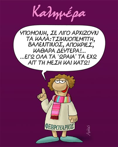 «Υπομονή, σε λίγο αρχίζουν τα καλά: Τσικνοπέμπτη, Βαλεντίνος, Απόκριες, Καθαρά Δευτέρα!… Εγώ όλα τα ωραία τα έχω απ’ τη μέση και κάτω!», μάς λέει στο σημερινό σκίτσο που δημοσιεύεται στην επίσημη σελίδα του σκιτσογράφου στο Facebook.