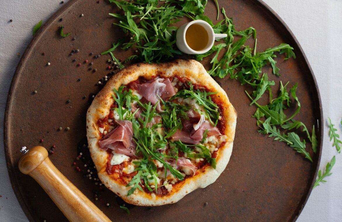Πίτσα με μοτσαρέλα, προσούτο, σάλτσα ντομάτας και ρόκα