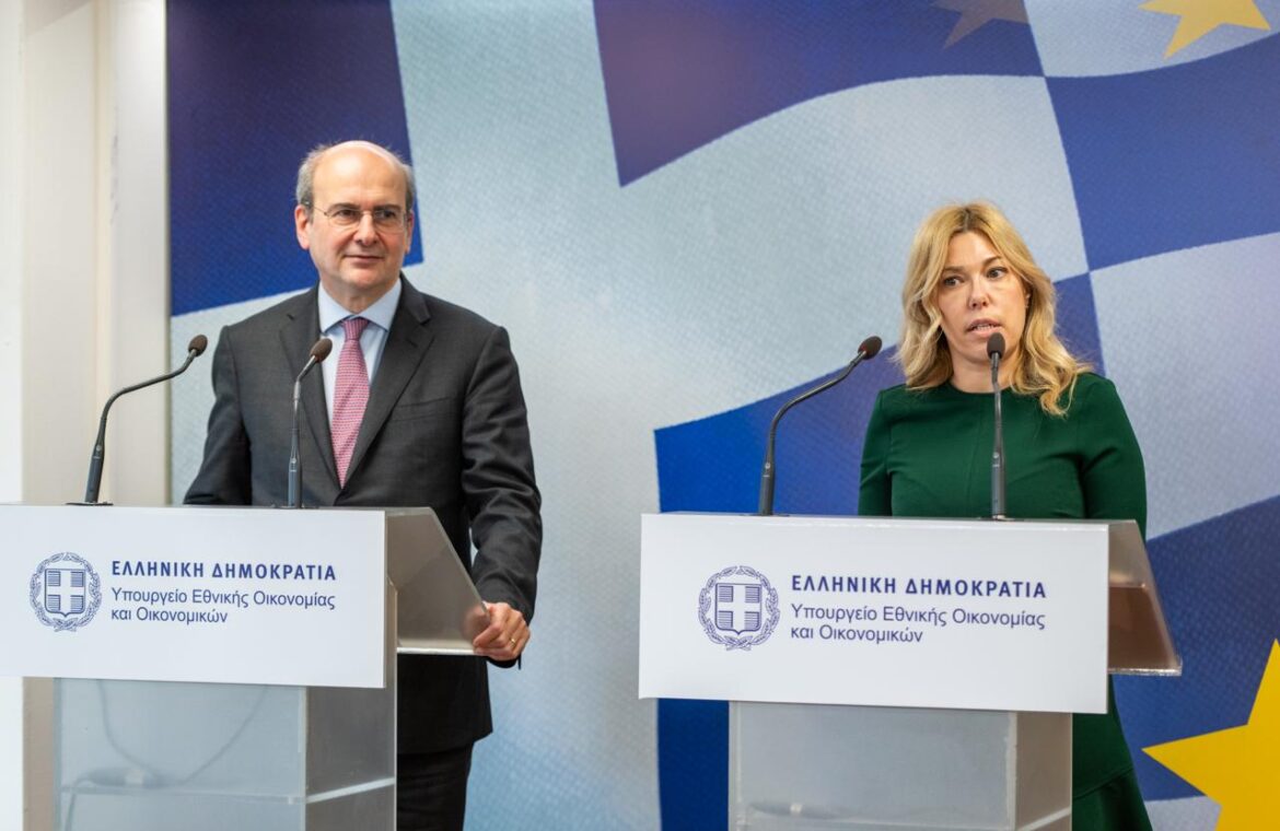 Ο υπουργός Εθνικής Οικονομίας και Οικονομικών Κωστής Χατζηδάκης και η γενική γραμματέας Χρηματοπιστωτικού Τομέα και Διαχείρισης Ιδιωτικού Χρέους, Θεώνη Αλαμπάση