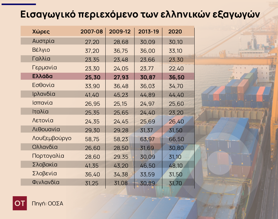 «Το εισαγωγικό περιεχόμενο των ελληνικών εξαγωγών , ή αλλιώς η εισαγόμενη συνιστώσα των εξαγωγών, αποτελεί μια ιδιαίτερα σημαντική μεταβλητή, καθώς αντανακλά τον βαθμό εξάρτησης της ελληνικής παραγωγής από ξένα ενδιάμεσα αγαθά που απαιτούνται για την παραγωγή των εξαγόμενων προϊόντων. Όσο υψηλότερη είναι η τιμή της μεταβλητής, τόσο περισσότερα ενδιάμεσα αγαθά χρειάζεται να εισάγει η ελληνική οικονομία για την παραγωγή των εξαγόμενων αγαθών, γεγονός που μειώνει την προστιθέμενη αξία της εγχώριας παραγωγής και επιβαρύνει το Ισοζύγιο Τρεχουσών Συναλλαγών», σύμφωνα με το ΚΕΠΕ.