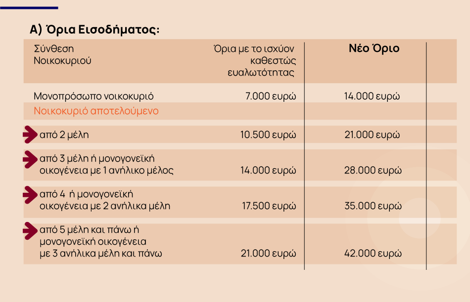 1) Διπλασιασμός των ορίων, εισοδηματικών και περιουσιακών, προκειμένου να χαρακτηριστεί ένας οφειλέτης επιλέξιμος στο πλαίσιο της υποχρεωτικής αποδοχής του εξωδικαστικού μηχανισμού από τους πιστωτές. Προϋπόθεση είναι ο οφειλέτης να έχει ανώτατο όριο ήδη μη εξυπηρετούμενων τραπεζικών οφειλών ( σε τράπεζες ή servicers) τις 300.000 ευρώ.