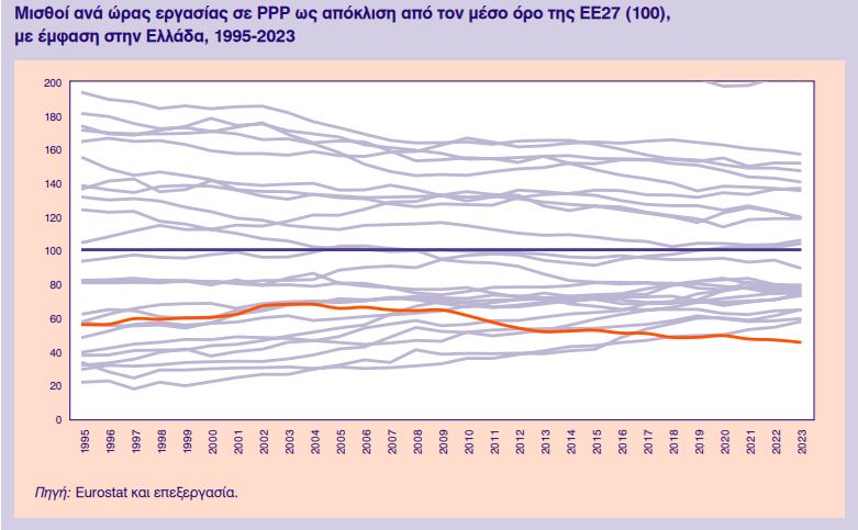 Η μελέτη του ΚΕΠΕ έχει σχέση με το ωρομίσθιο των Ελλήνων σε όρους αγοραστικής δύναμης – τεκμηριώνοντας πως είμαστε πια τελευταίοι στην ΕΕ, πίσω ακόμη και από τη Βουλγαρία. Ακόμη χειρότερα, αποδεικνύει πως συμβαίνει ήδη από το 2021 – οπότε ότι, η κατάσταση αυτή έχει δυστυχώς παγιωθεί, αποτελεί δομικό πρόβλημα και η τάση είναι προς τα κάτω (κόκκινη καμπύλη στο γράφημα).