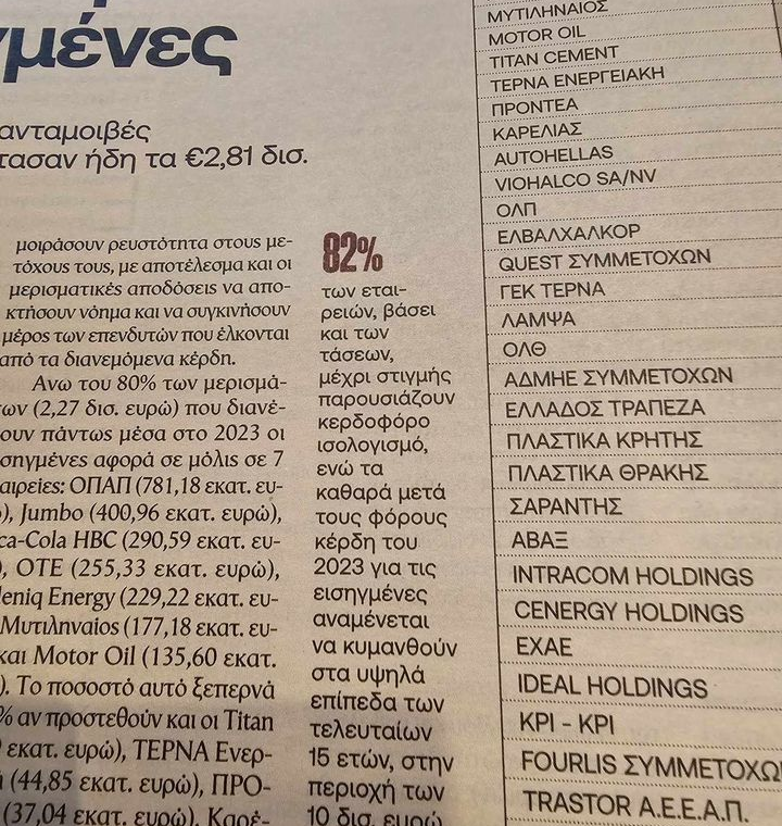 1.Τα καθαρά κέρδη το 2023 για το 82% των εισηγμένων στο Χρηματιστήριο εταιριών καταγράφουν ρεκόρ 15ετίας με καθαρά κέρδη στα 10 δισεκατομμύρια ευρώ!