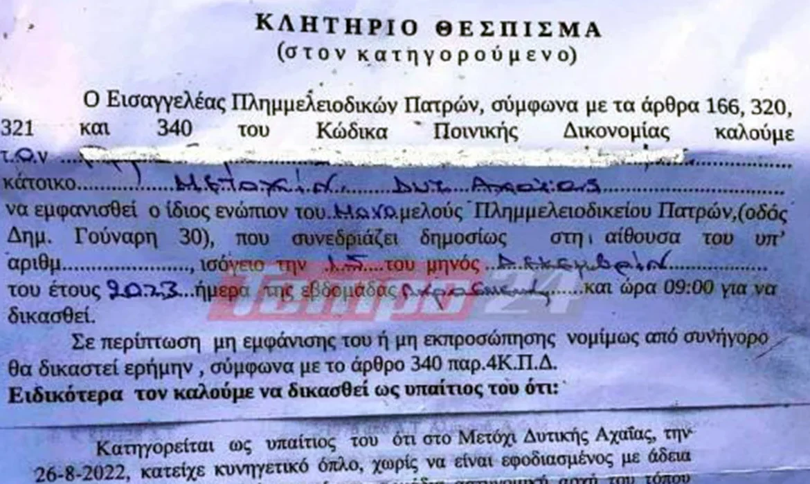 Ακριβώς 20 χρόνια μετά τον θάνατο του κλήθηκε από την εισαγγελία Πατρών να καταθέσει γιατί δεν ανανέωσε την άδεια της κυνηγητικής του καραμπίνας.