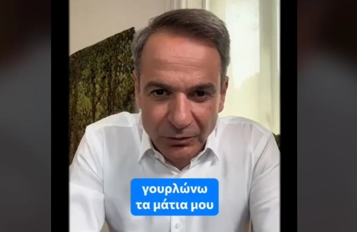 Στο βίντεο ο Κυριάκος Μητσοτάκης αυτοσαρκάζεται για τα μάτια του και για τα μαλλιά του.