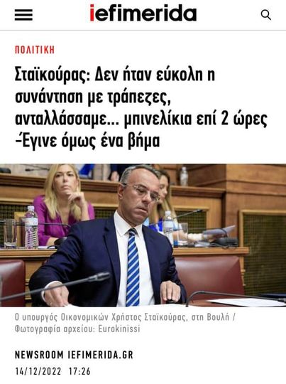 O υπουργός Οικονομικών συνομιλώντας με κοινοβουλευτικούς συντάκτες αναφέρθηκε στη συνάντηση που είχε νωρίτερα σήμερα, λέγοντας ότι οι «τράπεζες έφτασαν στα όριά τους». Παράλληλα δεν δίστασε να υποδυθεί το ρόλο του πολιτικού μιας κυβέρνησης που δίνει μάχες για να προστατεύσει τους αδύναμους οικονομικά πολίτες, λέγοντας ότι «δύο ώρες μπινελικονόμασταν».
