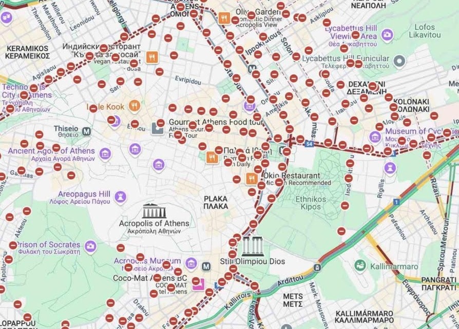 Ολα κλειστά στο κέντρο της Αθήνας. Το χαρακτηριστικό κόκκινο σήμα «stop» εμφανίζεται στους χάρτες της Google πάνω σε μια επιχείρηση που είναι κλειστή εκείνη την ώρα.