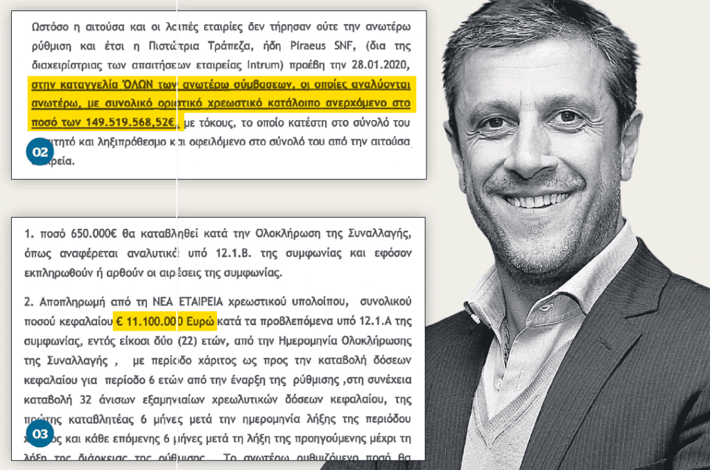 Πιο συγκεκριμένα, βάσει της συμφωνίας εξυγίανσης που αποκάλυψε το Documento, από δάνειο 149.519.568,52 ευρώ ο Κ. Πηλαδάκης συμφώνησε με την Τράπεζα Πειραιώς, στην οποία οφείλουν οι εταιρείες του, να πληρώσει 23,6 εκατ. ευρώ και μάλιστα σε διάρκεια 22 χρόνων.