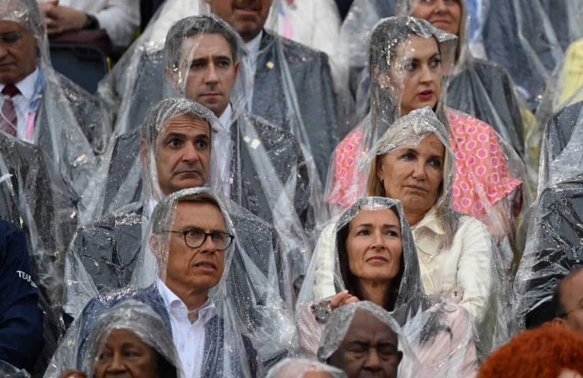 Ο καιρός τα έκανε μούσκεμα για τους ξένους ηγέτες που παρακολουθούν την τελετή έναρξης των Ολυμπιακών Αγώνων.