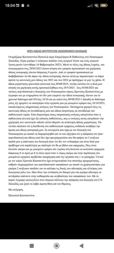 Θα παρακαλούσα την παθολόγο κ.Πατουλιά Κωνσταντίνα Επιμελ Β οποιαδήποτε πρόβλημα έχει με τα ανήλικα τέκνα της να μην τα επικαλείται δημοσίως προκειμένου να της χορηγηθεί η άδεια ανατροφής τέκνου.