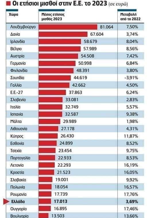 Μέσος ετήσιος μισθός χωρών της Ε.Ε για το έτος 2023. Η Πολωνία και η Ρουμανία έχουν καλύτερο βιοτικό επίπεδο από εμάς.