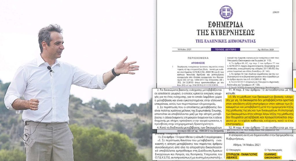 Βεβαίως, σύμφωνα και με υπουργική απόφαση η οποία εκδόθηκε τον Μάιο του 2021 και υπογράφεται από τον πρώην υπουργό Αγροτικής Ανάπτυξης Σπήλιο Λιβανό, αλλά και από τον Γ. Οικονόμου ο οποίος την εποχή εκείνη ήταν υφυπουργός, ο Κυρ. Μητσοτάκης θα μπορούσε κάλλιστα να μεταβιβάσει προσωρινά τα δικαιώματά του ώστε τα χρήματα των επιδοτήσεων να καταλήγουν σε έναν πραγματικό αγρότη που θα εκμεταλλευόταν τη γη του. Ο πρωθυπουργός μάλιστα δεν θα εστερείτο τα δικαιώματά του εσαεί, αφού με τη λήξη του συμβολαίου μεταβίβασης θα επέστρεφαν στην κατοχή του και, εφόσον ήθελε, θα συνέχιζε να λαμβάνει τις ευρωπαϊκές επιδοτήσεις. Η σχετική απόφαση των Λιβανού – Οικονόμου προβλέπει συγκεκριμένα ότι «με τη μίσθωση των δικαιωμάτων βασικής ενίσχυσης με γη, τα δικαιώματα δεν μεταβιβάζονται οριστικά στον αποδέκτη αλλά επιστρέφουν στον κάτοχο των δικαιωμάτων και μεταβιβαστή μετά την ημερομηνία λήξης της μίσθωσης της γης και των δικαιωμάτων».
