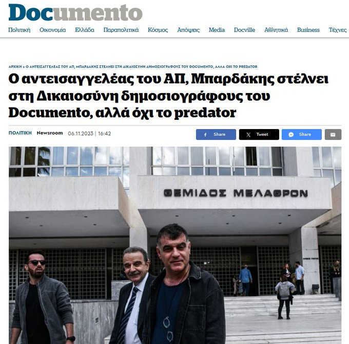 Ο αντεισαγγελέας του ΑΠ, Μπαρδάκης στέλνει στη Δικαιοσύνη τον @KostasVaxevanis και μένα επειδή δημοσιοποιήσαμε το πόρισμα του ΣΔΟΕ για τις αναθέσεις της Σοφίας Νικολάου την οποία «καθάρισε«. Για το predator που έχει ενημερωθεί ότι ήταν σε παρακολούθηση καμία ενέργεια