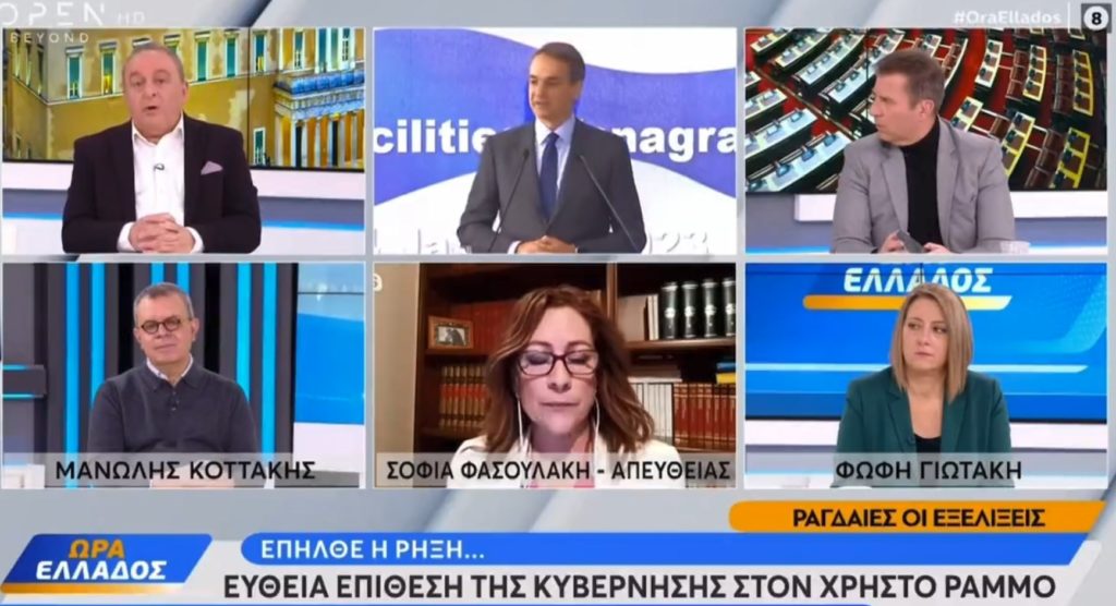 Ήταν η στιγμή που η δημοσιογράφος του OPEN Σοφία Φασουλάκη μεταφέροντας το κυβερνητικό ρεπορτάζ είπε πως «ο πρωθυπουργός δεν γνώριζε, δεν είχε γνώση αυτών των γεγονότων, ούτε ενημέρωση, ούτε είχε δώσει εντολή για να γίνουν αυτές οι παρακολουθήσεις και του καταλογίζουν μια σειρά ατοπημάτων».